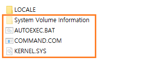 LOCALE 폴더, System Volume Information 폴더, AUTOEXEC.BAT 파일, COMMAND.COM 파일, KERNEL.SYS 파일로 구성이 되어있습니다.
