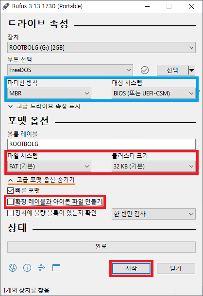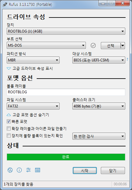 ● Rufus로 MS-DOS 부팅 USB 만들기