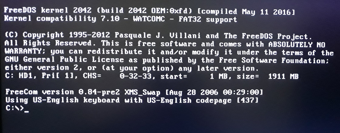 만든 MS-DOS USB로 부팅한 화면입니다.