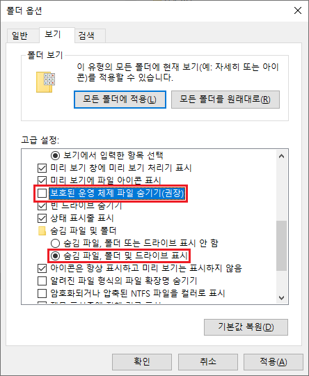 폴더 옵션의 보기 탭 아래 있는 고급 설정에서 '보호된 운영 체제 파일 숨기기(권장)'의 체크를 해제하고 숨김 파일 및 폴더 항목에서 '숨김 파일, 폴더 및 드라이브 표시'를 선택하면 됩니다.