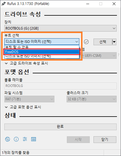 ● Rufus로 FreeDOS 부팅 USB 만들기