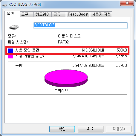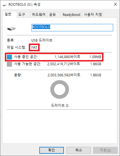 2G 메모리를 사용했기 때문에 FAT로 파티션이 설정되었고 사용 공간이 약 1.09MB로 표시됩니다.