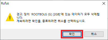 USB 메모리의 모든 내용이 삭제된다는 경고가 나옵니다.