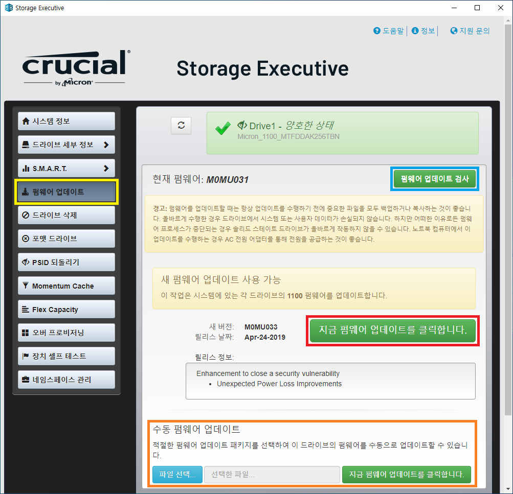 마이크론 SSD는 펌웨어 업데이트가 있으면 스샷처럼 '새 펌웨어 사용 가능'이라는 메시지가 표시됩니다.