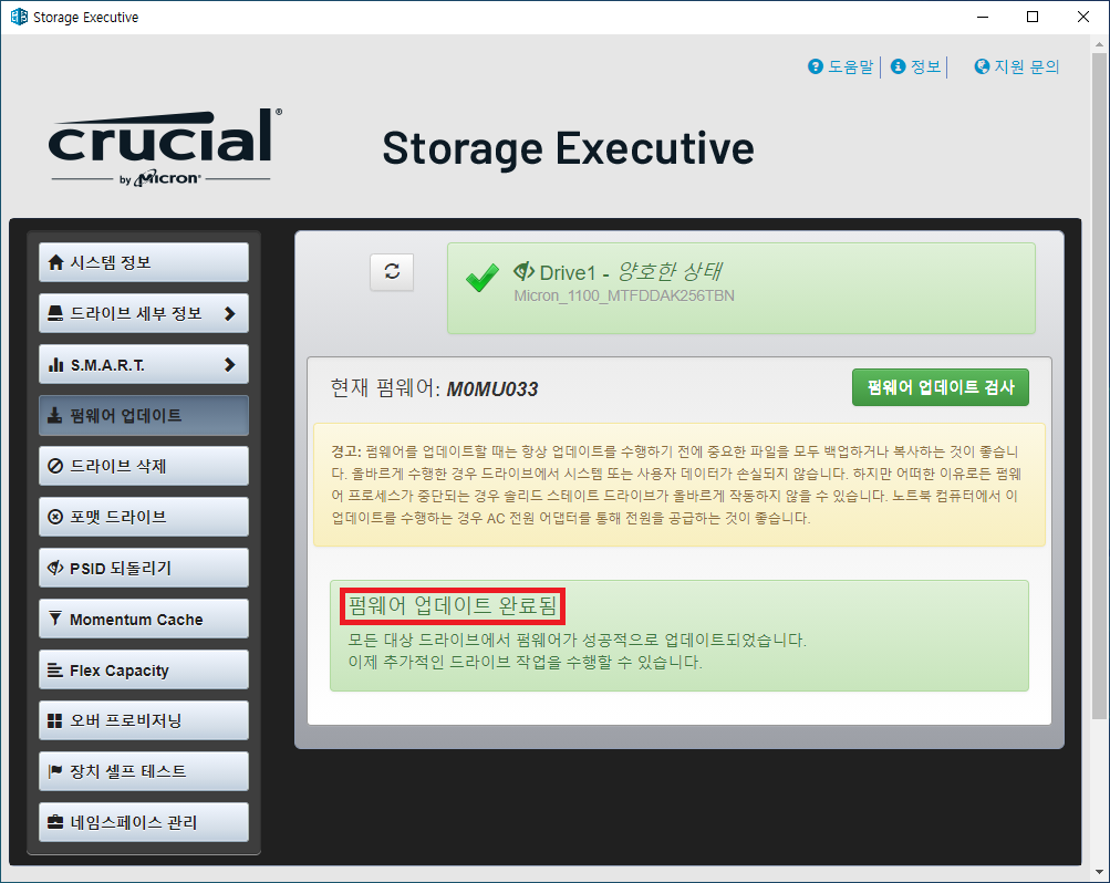 Crucial Storage Executive의 경우 마이크론 SSD 지원 페이지에 보이지 않는 구형 모델이나 OEM 모델이라도 펌웨어 업데이트가 가능한 경우가 있으니 해당 경우 Crucial Storage Executive로 시도해 보길 바랍니다.