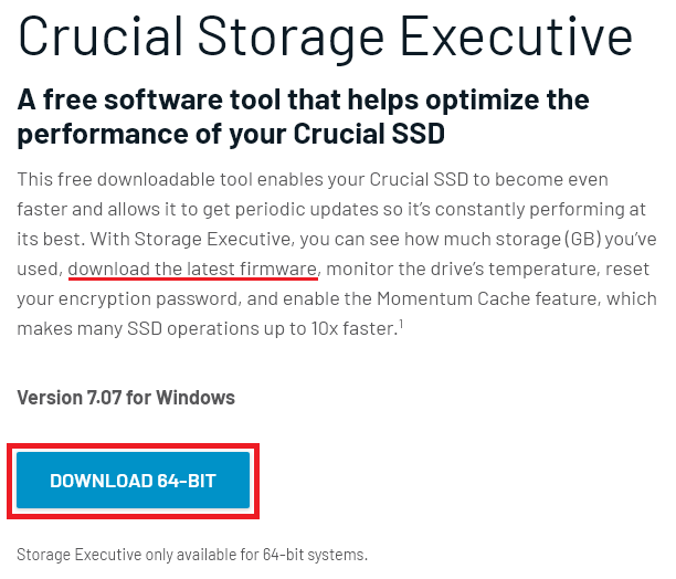 Crucial Storage Executive 프로그램은 마이크론 SSD 전용 프로그램으로 마이크론 SSD의 모니터링과 펌웨어 업데이트, 초기화, 암호화 재설정, 모멘텀 캐시 등을 사용할 수 있습니다.