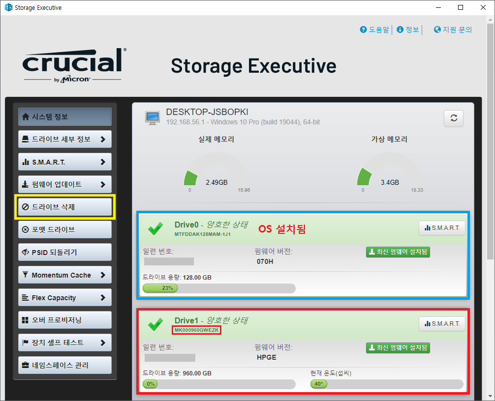 진행할 컴퓨터에 마이크론 SSD가 2개 설치되어 있습니다.
