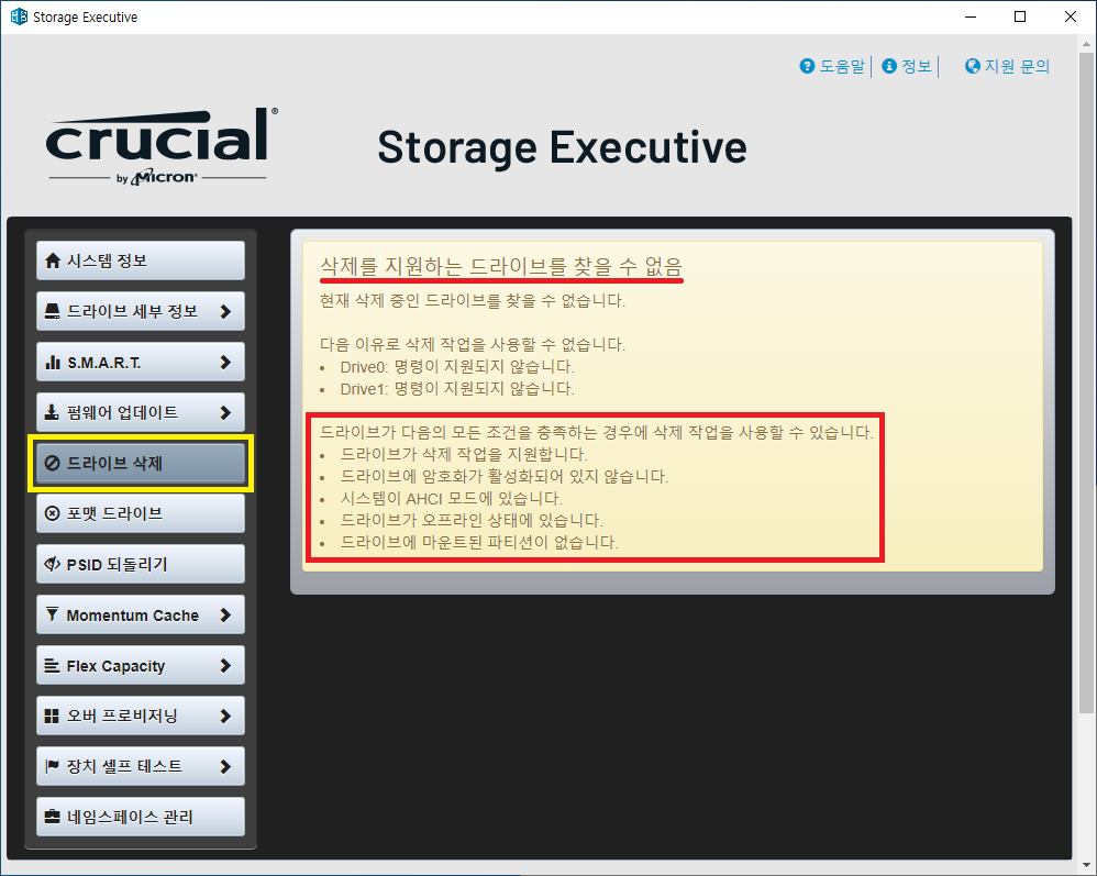 이유로 드라이브 0, 1 모두 명령이 지원되지 않는다고 표시되어 있지만 드라이브 0은 OS가 설치되어 있어서 안되는 경우입니다.