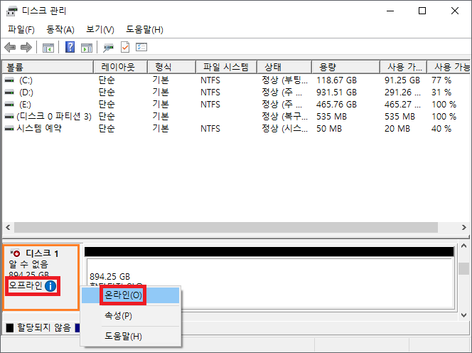 디스크 관리(diskmgmt.msc) 창에서 초기화한 마이크론 SSD를 선택하고 우 클릭 후 온라인을 클릭하면 온라인 상태로 변경됩니다.