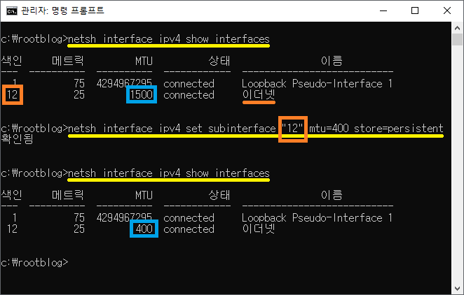 netsh interface ipv4 set subinterface "이더넷 색인번호" mtu=400 store=persistent 를 입력합니다.