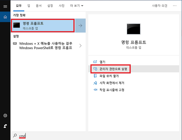 관리자 권한으로 명령 프롬프트를 실행합니다.