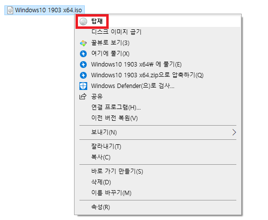 ISO 파일을 선택 후 우 클릭해서 나오는 팝업 메뉴에서 "탑재"를 클릭합니다.