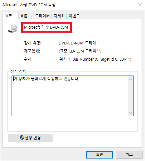 장치 관리자를 확인해보면 "Microsoft 가상 DVD-ROM"이 추가 되어 있습니다.