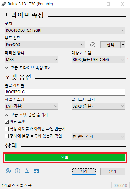 ● Rufus로 FreeDOS 부팅 USB 만들기