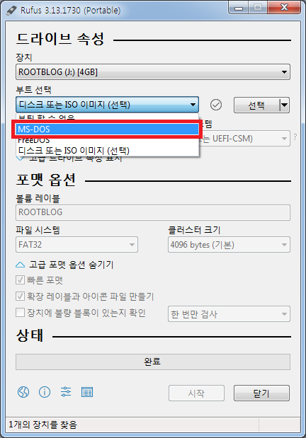● Rufus로 MS-DOS 부팅 USB 만들기