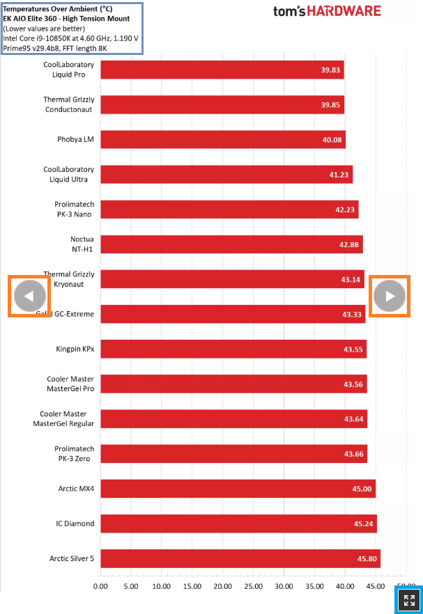 해외 하드웨어 사이트로 유명한 탐스하드웨어(tom's Hardware)에서 제공하는 2021년 써멀 페이스트 성능 비교 차트입니다.