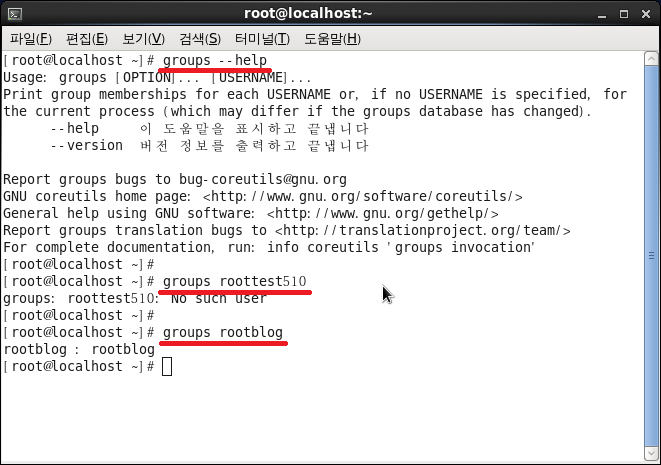 roottest510 과 rootblog 라는 그룹에 속해있는 계정을 확인해봤습니다.