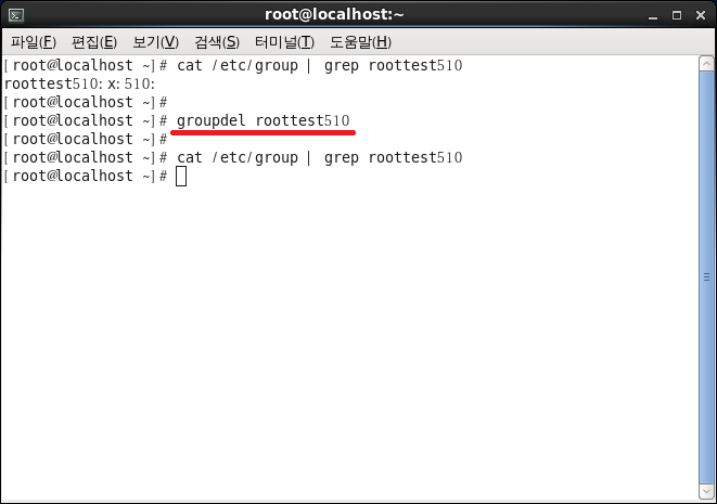 테스트용으로 만든 roottest510 그룹을 삭제 해보았습니다.
