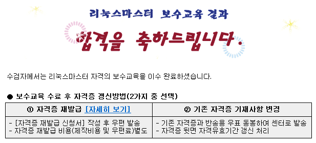 합격 축하 맨트와 자격증 갱신하는 2가지 방법의 안내가 나옵니다.